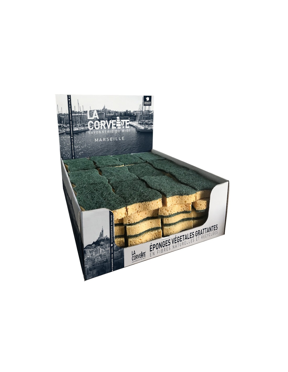 Esponja vegetal biodegradável com um lado de esfregão feito com abrasivos minerais e fibras naturais e recicladas.