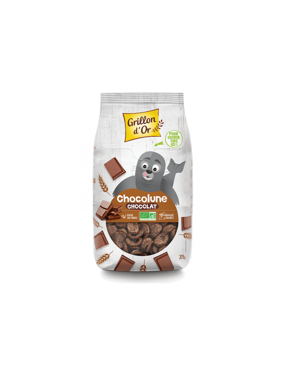 trigo integral* 33%, farinha de trigo* 23%, açúcar de cana*, milho*, cacau em pó magro*, chocolate negro* 3,2% (pasta de cacau*, açúcar de cana*, manteiga de cacau*), cacau em pó*, sal.