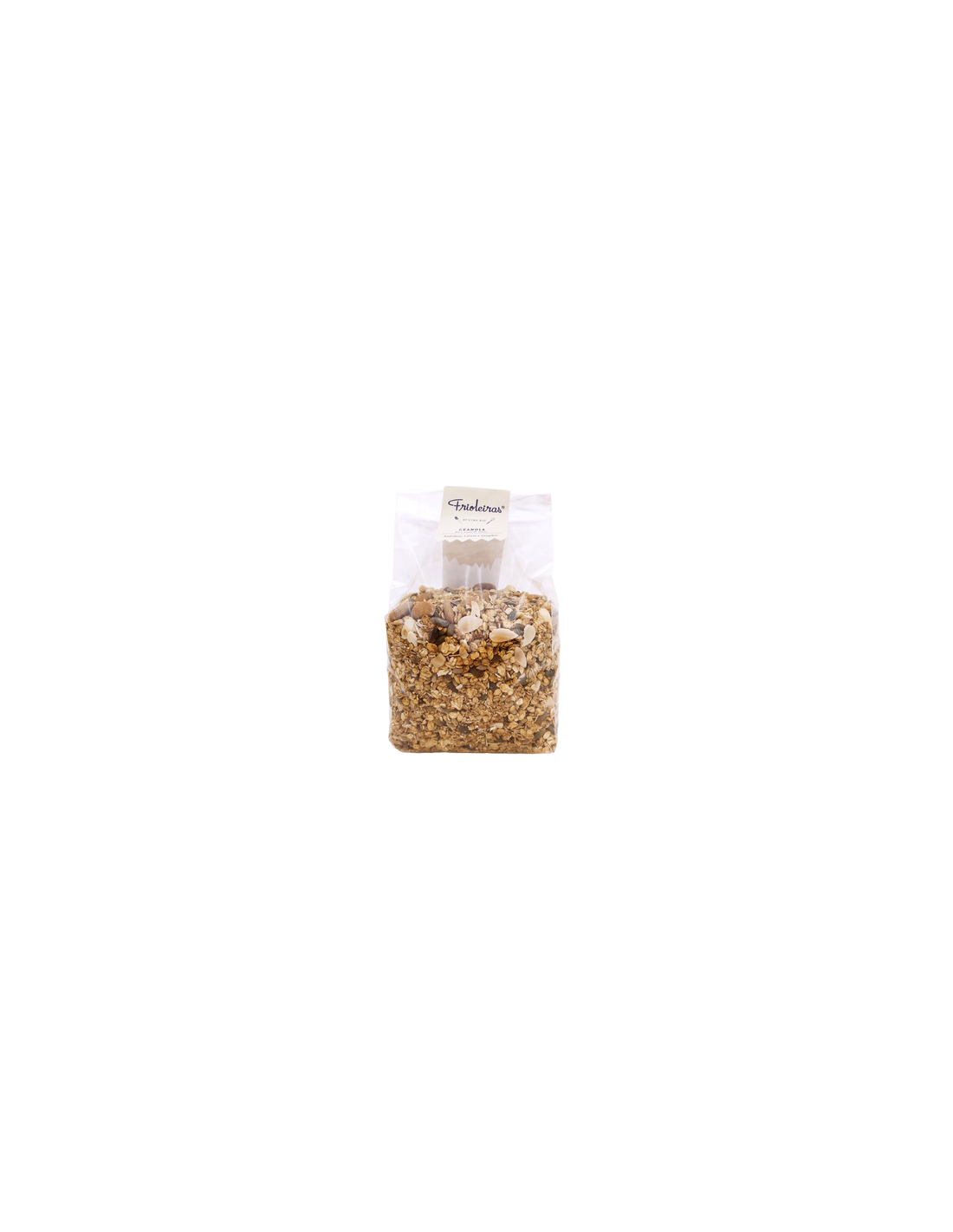 Flocos de aveia isentos de glúten*, amêndoas* (17%), sementes de abóbora* (10%), sementes de girassol* (10%), tâmaras* (8%), caju* (7%), óleo de coco* e canela em pó* e gengibre*.